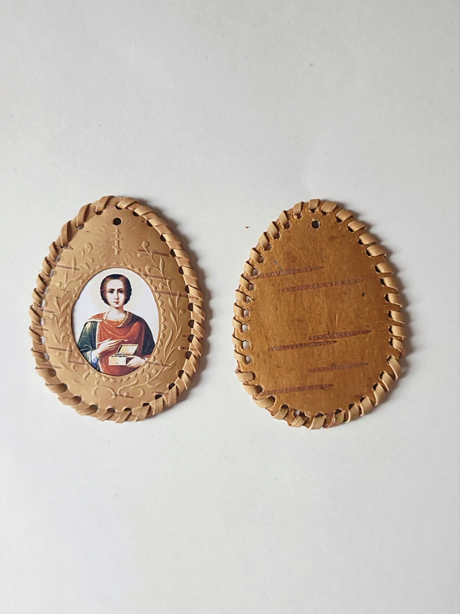 Икона в бересте для ношения с собой. На иконе изображен Великомученик и целитель Пантелеимон.